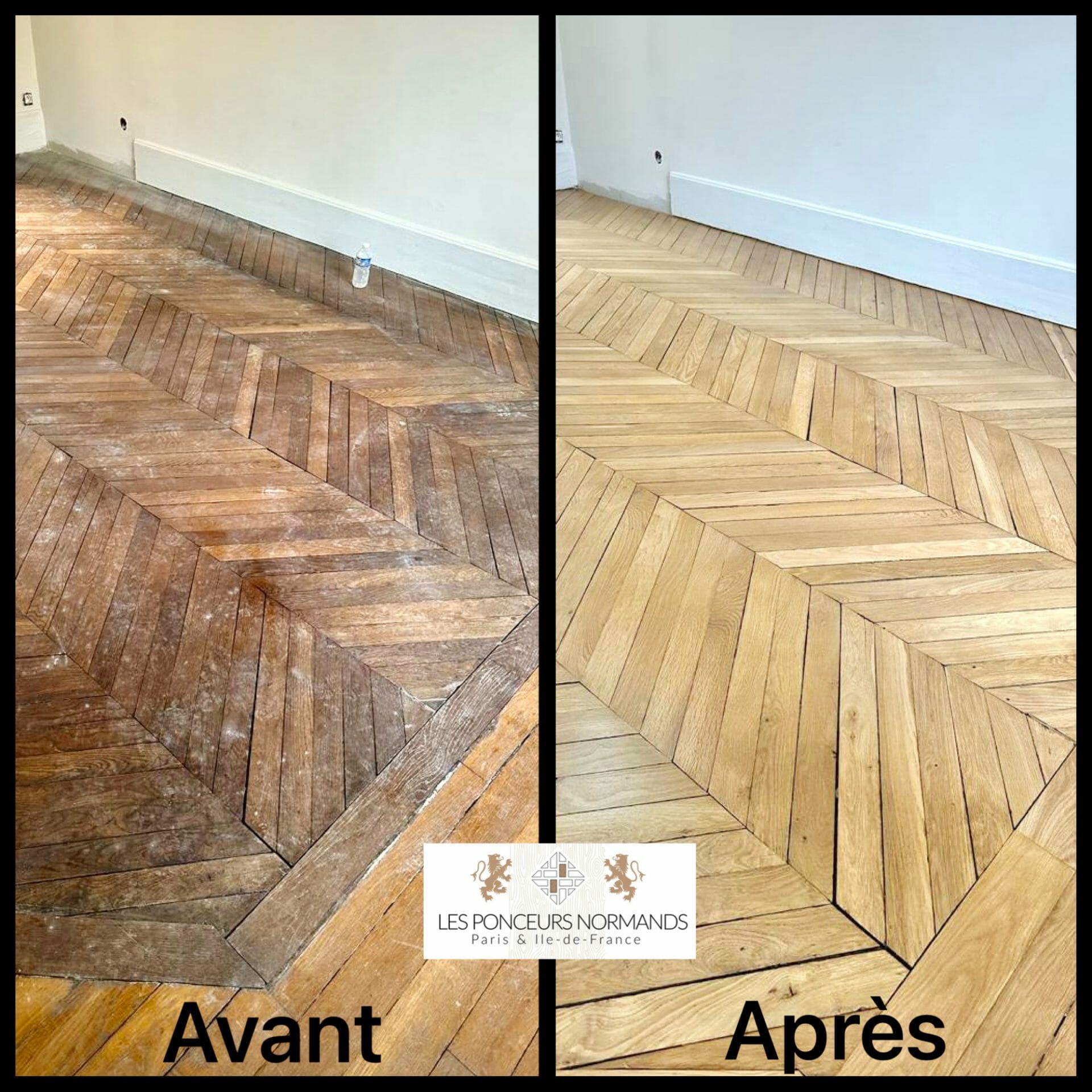 Comme vous le voyez sur cette photo tiré du site https://ponceurs-normands.fr/, un des gros avantages du parquet massif est sa capacité à être rénové « comme neuf ».